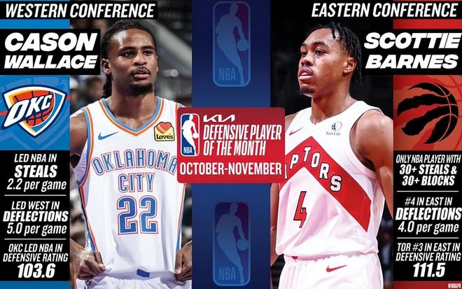 本赛季是NBA正式设立月最佳防守球员奖项的第二年,两位首次获奖者印证了防守价值的多元化。