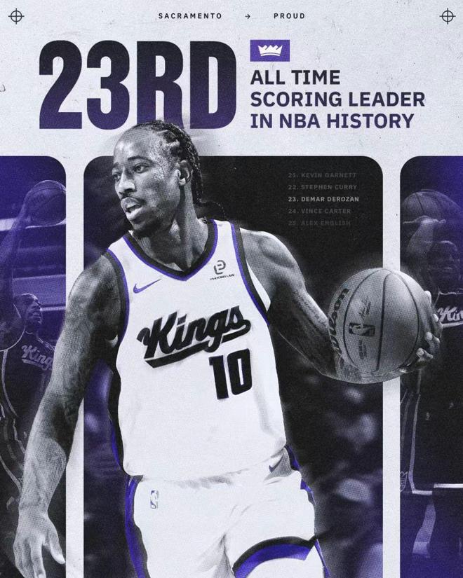 本场比赛也是德罗赞职业生涯常规赛得分突破25728分,超越文斯·卡特,升至NBA历史得分榜第23位。