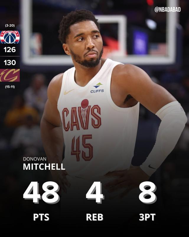 骑士对阵奇才比赛中,多诺万·米切尔第四节独得24分,全场48分,带领骑士从落后15分逆转取胜,并刷新本赛季末节得分纪录。...