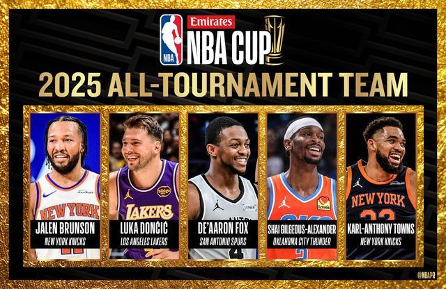 北京时间12月19日,NBA官方公布了2025-26赛季NBA杯最佳阵容名单,纽约尼克斯的杰伦-布伦森、洛杉矶湖人的卢卡-东契奇、圣安东尼奥马刺的达龙-福克斯、俄克拉荷马雷霆的谢伊-吉尔杰斯-亚历山大以及纽约尼克斯的卡尔-安东尼-唐斯成功入选。