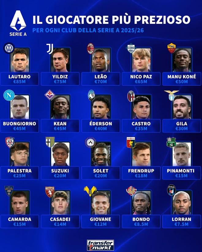 根据德转统计,意甲20家俱乐部身价最高球员如下: