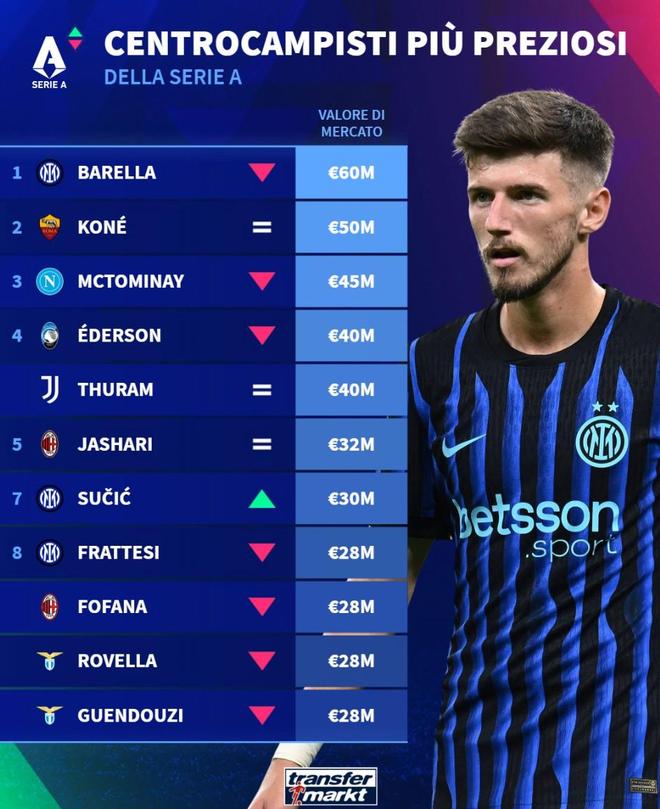德转更新意甲中场身价榜:巴雷拉6000万欧元领衔