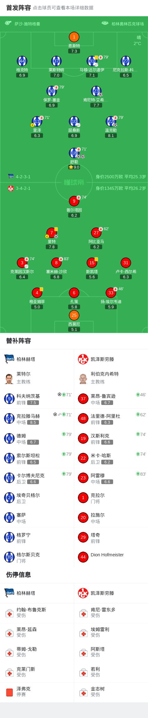 柏林赫塔6-1血洗凯泽斯劳滕,舒勒双响,克拉滕马赫替补1传1射