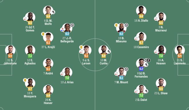 31-拉门斯;3-马兹拉维(69' 6-利马),26-海文(69' 15-约罗),23-卢克肖;16-迪亚洛,18-卡塞米罗(78' 37-梅努),8-布鲁诺·费尔南德斯,2-达洛特(85' 13-多古);18-姆伯莫,7-芒特(85' 11-齐尔克泽);10-库尼亚