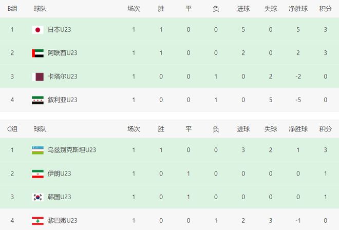 北京时间1月7日夜至8日凌晨,2026年U23亚洲杯小组赛首轮结束第二个比赛日争夺,共进行了四场比赛。日本男足5-0大胜叙利亚男足,乌兹别克斯坦男足3-1击败黎巴嫩男足,韩国男足与伊朗男足0-0互交白卷,卡塔尔男足0-2不敌阿联酋男足,多个小组格局随之初现端倪。