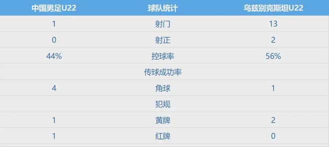 全场技术统计显示,U22国足在射门次数上以1比13绝对落后,运动战射门数甚至为零。这一数据清晰反映了球队在进攻端遭遇的困难。