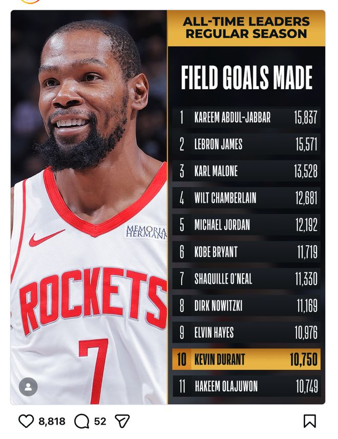 值得一提的是,杜兰特在本场比赛中总进球数超越奥拉朱旺,升入NBA历史总进球第十位,同时达成常规赛5000次助攻里程碑,成为NBA历史第6位至少取得30000分与5000次助攻的球员。
