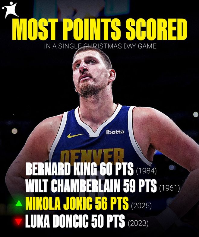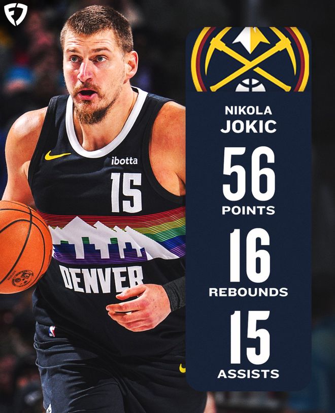 全场比赛,约基奇出战43分钟,投篮21中15,三分6中4,罚球23中22,命中率71.4%,三分命中率66.7%,真实命中率高达90%。他连续刷新历史纪录:个人第180次三双位列历史第二;成为历史首位单场55+15+15球员;加时赛独得18分创历史第一;单场50+15+15的表现比肩哈登,位列历史第二;年终大战多次三双历史第三。