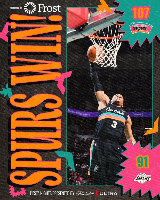 NBA常规赛,马刺主场107-91力克湖人,约翰逊替补砍下27分,文班亚马16分14篮板,东契奇三双无力回天,湖人三连胜被终结。...