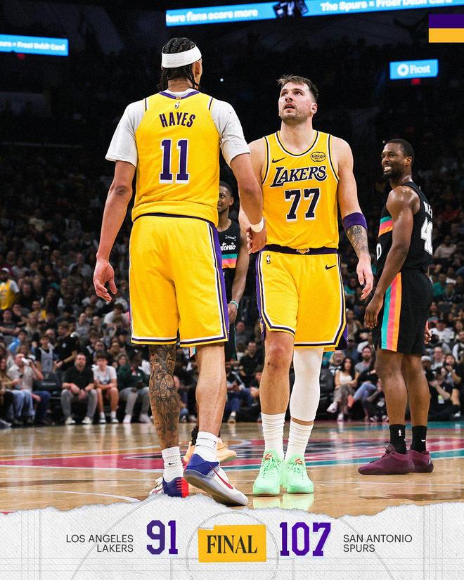 本场比赛,湖人队的东契奇表现依旧抢眼,贡献38分、10个篮板和10次助攻的三双数据,但未能带队取胜。湖人其他球员中,拉拉维亚得到16分和7个篮板,海耶斯贡献10分和7个篮板,艾顿拿下9分和6个篮板。由于勒布朗缺席,范德比尔特首发出场。
