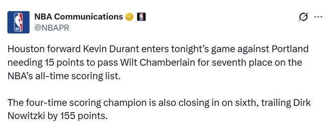 在本周四火箭对开拓者的比赛中,杜兰特砍下37分,使得其生涯总得分达到31405分。威尔特-张伯伦在1959至1973年的职业生涯中共斩获31419分,曾长期保持联盟历史得分王的位置。预计火箭今日再战开拓者时,杜兰特有望独享第七的位置。