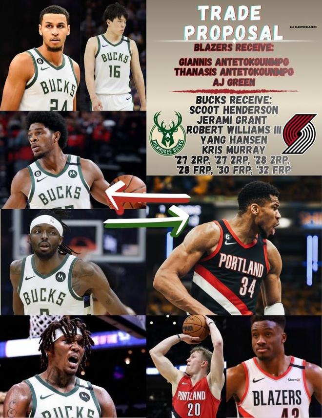 在杨瀚森面临困境的同时,关于他是否被交易的讨论也日益升温。近期,开拓者队的媒体 SleeperTrailBlazers 提出了一个引人注目的交易建议:开拓者队与雄鹿队进行大规模的交易。根据这一方案,开拓者队将得到扬尼斯·阿德托昆博(字母哥)、萨纳西斯·阿德托昆博和A.J.格林,而雄鹿队将获得斯库特·亨德森、杰拉米·格兰特、罗伯特·威廉姆斯三世、杨瀚森、克里斯·穆雷以及多个未来的首轮和次轮选秀权。
