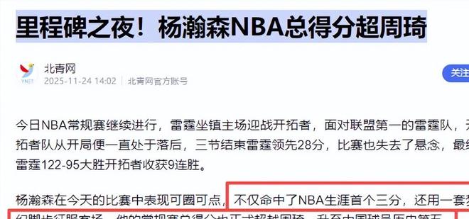 北青网(里程碑之夜!杨瀚森NBA总得分超周琦2025.11.24)