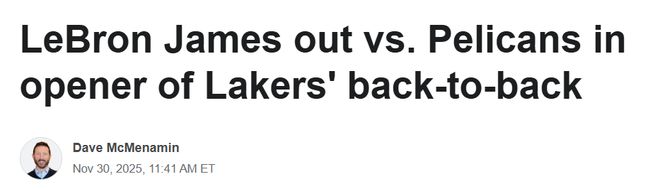 北京时间12月1日,湖人球星勒布朗-詹姆斯因左脚伤病管理,将缺席今日对阵新奥尔良鹈鹕队的比赛。即将41岁的詹姆斯此前因坐骨神经痛缺席了本赛季前14场比赛,上赛季...