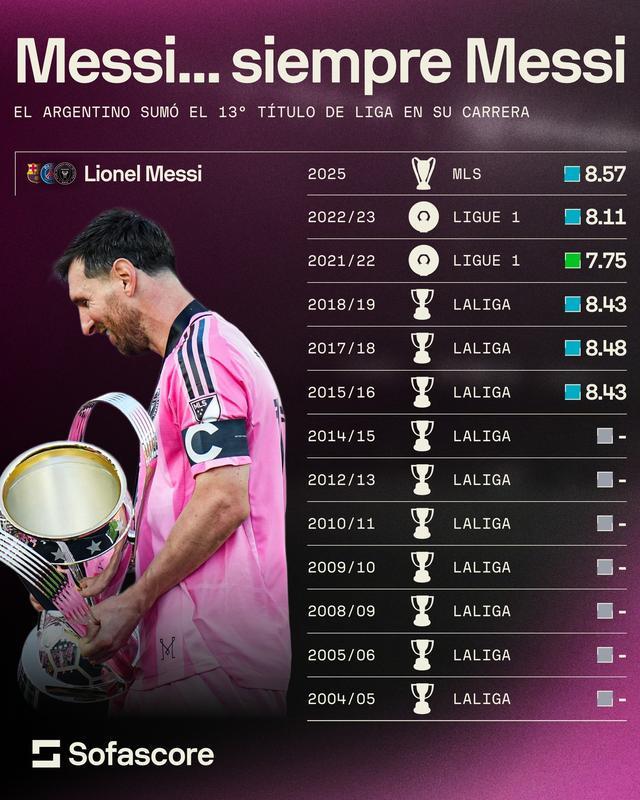 梅西的联赛冠军起步于巴塞罗那 在诺坎普出道时 他便迅速融入俱乐部历史最辉煌的时代。随后 在巴黎圣日耳曼他延续了统治力 夺下两座法甲冠军。而在加盟迈阿密国际两年后 他再度用冠军证明自身的影响力和决定性。