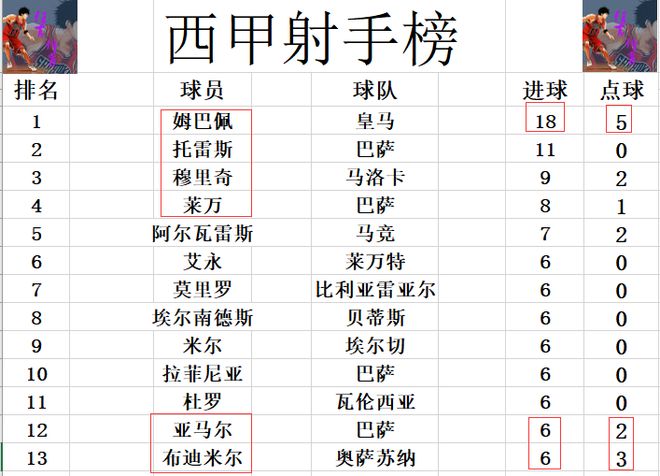 射手榜方面,姆巴佩点球建功,18球稳居榜首;托雷斯11球位列第2;穆里奇9球第3,莱万8球第4;布迪米尔梅开二度后升至6球,挤入前十。