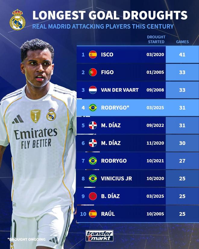 德国转会市场网站近日统计了自2000年以来,皇家马德里攻击手所经历的最长进球荒排名。其中,当前正遭遇进球荒的巴西边锋罗德里戈以连续31场未能破门,位列榜单第四位,且这一数据仍在持续。