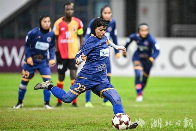 11月17日下午,巴姆卡通女足(伊朗)队员哈穆迪在比赛中罚射点球。(湖北日报全媒记者任勇摄)